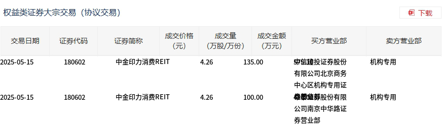 5月15日,中金印力消费REIT大宗交易成交235万股,成交额1001.1万元,占当日总成交额的49.18%,成交价4.26元,较市场收盘价4.27元折价0.23%。