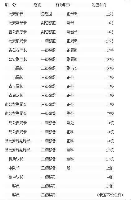 说完之后,相信大多数的看官老爷们都有点蒙圈了吧。没关系,我们列出来了一张对应表,可以让看官老爷们一目了然的了解到警衔,军衔,行政官职的对应职务。