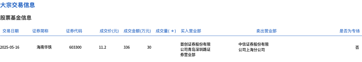5月16日,海南华铁大宗交易成交30万股,成交额336万元,占当日总成交额的0.16%,成交价11.2元,较市场收盘价11.2元持平。