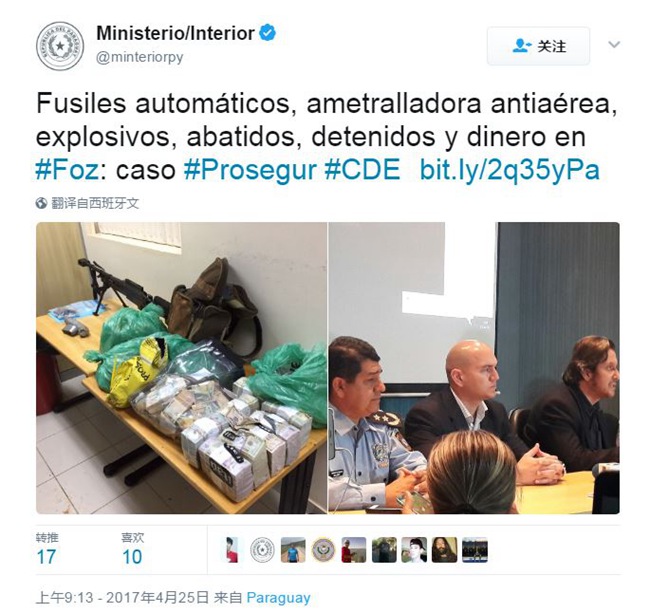 目前东方城地区的警方负责人已经被解职,巴拉圭安全部门官员怀疑警方内部有人为劫匪提供帮助,数名警官已被停职接受调查。