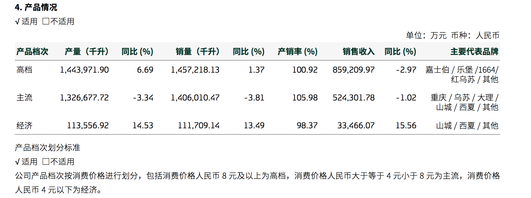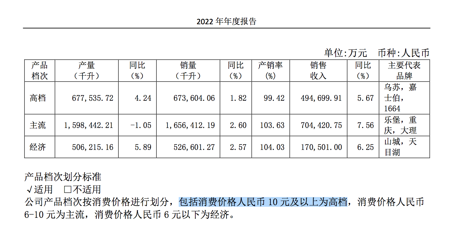 在公司2022年年报中,划分高档产品的价格是10元,主流、经济产品的划分价格分别为6至10元和6元以下。而在2023年,重庆啤酒高档产品的划分价格改为8元及以上,主流、经济产品的划分价格改为4至8元和4元以下。