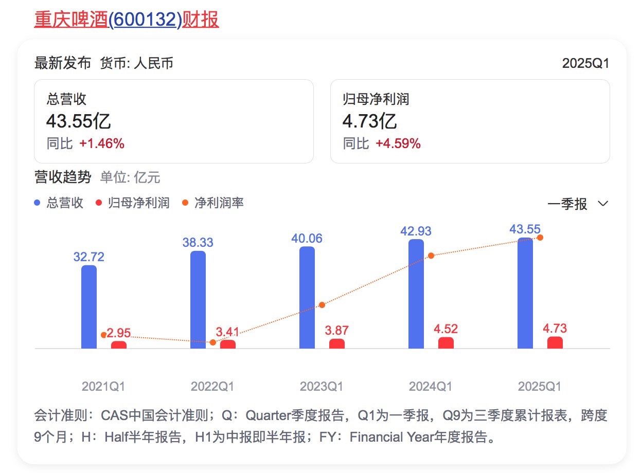 2024年,公司实现营收约为146.45亿元,相比上年同期下跌1.15%;即使扣除嘉威啤酒诉讼影响,扣非净利润也出现逾7%同比下滑。2025年一季度虽实现营收、净利润双升,但低单位数的增幅与此前三年高歌猛进的上升势头不可同日而语。