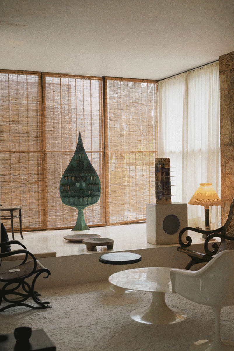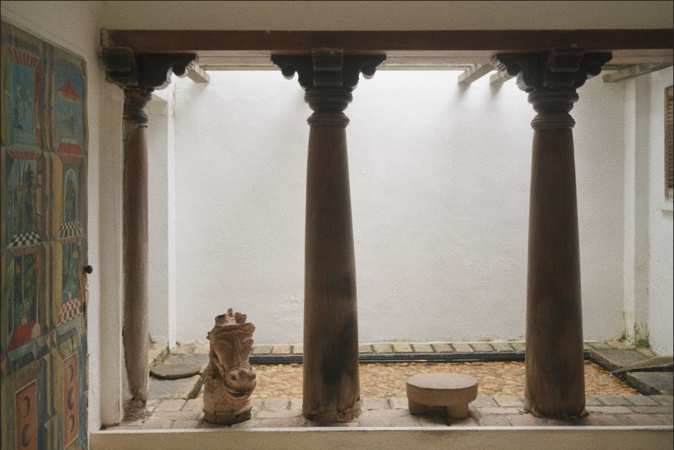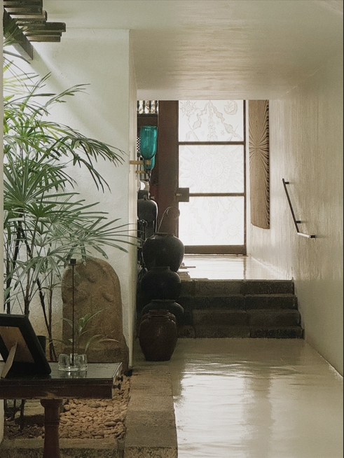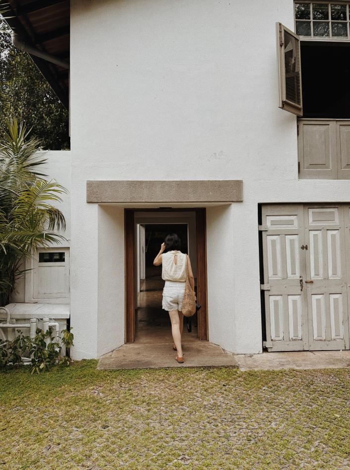 前方Saram House在椰林深处显形。这座为画家设计的居所,竟将一间废旧的荷兰仓库改造成了光影剧场。倾斜的屋顶切割出流动的光带,斑驳的白墙成了天然画布,让人联想到毛姆笔下"面纱"般朦胧的殖民地往事。巴瓦善用光影,投入巴瓦光线的叙事线索中,刚才路上正在升高的焦虑,瞬间就被安抚了。光线的金手指,确有魔力。