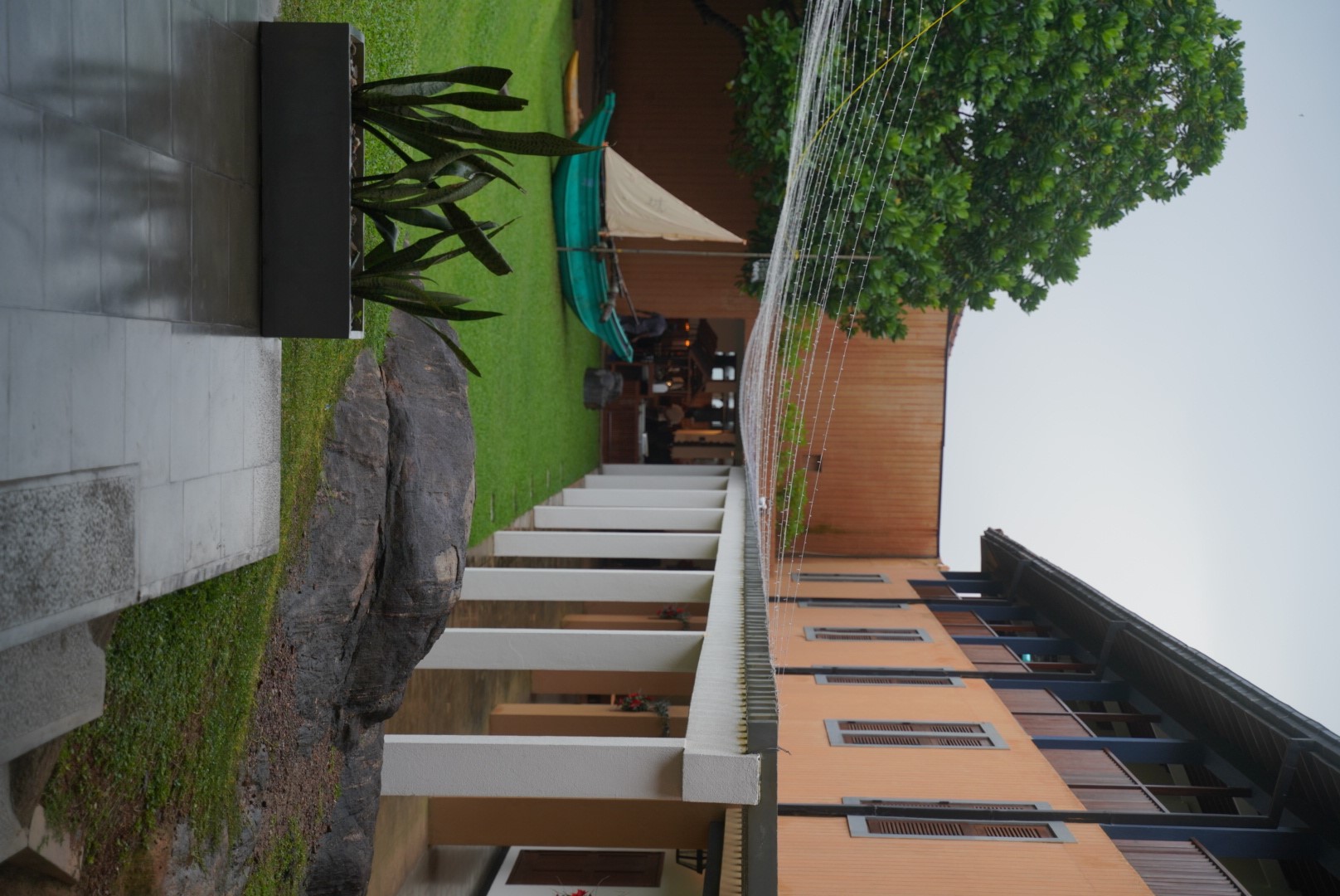 深入酒店,与建筑合二为一的岩壁引导我深入探索。仰起头,悬挑屋檐在湿润的空气中舒展,像某种热带阔叶植物凝固的切片。巴瓦总是以退让的姿态进入自然:粗粝的火山岩基座与蕨类共生,混凝土立柱缠绕着藤萝的静脉,所有直角都被攀援植物啃噬成柔和的弧。傍晚的太阳雨来得像一场即兴的爵士乐,而雨帘穿透挑空大堂的格栅顶棚,在柚木地板上敲出节拍时,我正蜷在悬臂式露台的阴影里。我一错不错地凝视水珠沿钢索滑向无边际水景,那里金属与液体正在进行一场私密的导电实验。