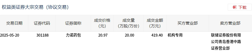 5月20日,力诺药包大宗交易成交20万股,成交额419.4万元,占当日总成交额的1.17%,成交价20.97元,较市场收盘价21.18元折价0.99%。