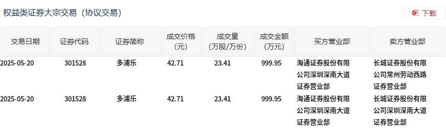 5月20日,多浦乐大宗交易成交46.82万股,成交额1999.9万元,占当日总成交额的12.13%,成交价42.71元,较市场收盘价49.73元折价14.12%。
