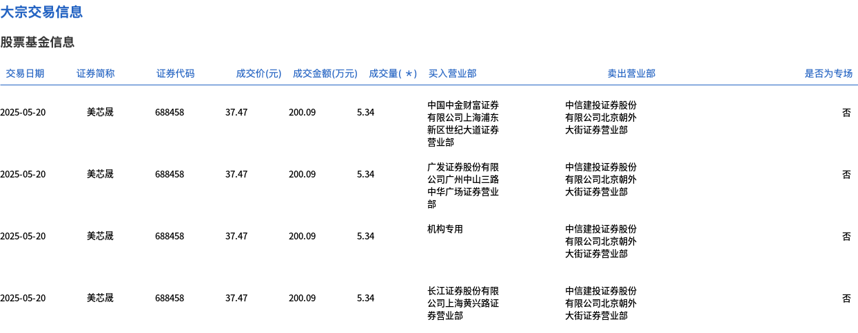 5月20日,美芯晟大宗交易成交31万股,成交额1161.57万元,占当日总成交额的10.12%,成交价37.47元,较市场收盘价41.41元折价9.51%。