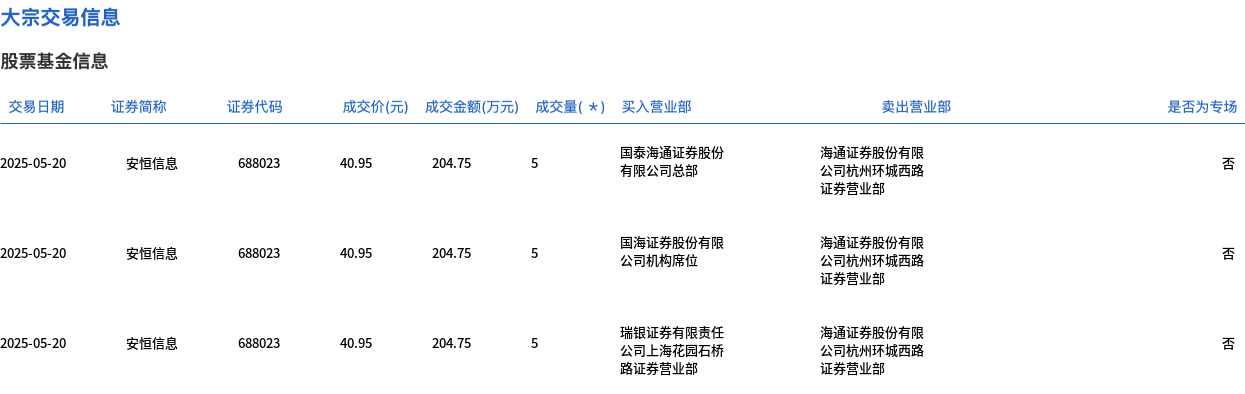 5月20日,安恒信息大宗交易成交15万股,成交额614.25万元,占当日总成交额的5.92%,成交价40.95元,较市场收盘价47.07元折价13%。