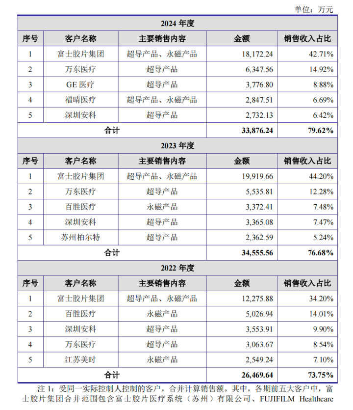 成为股东后,GE医疗在2024年出现在了健信超导的前五大客户名单之列,以8.88%的收入占比位列第三。