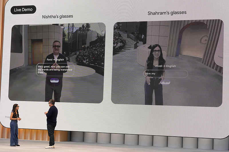 同时这款眼镜支持多语言即时翻译。两位工作人员在台上戴上眼镜面对面对话,演示了将波斯语和印地语对话翻译成英语的功能。