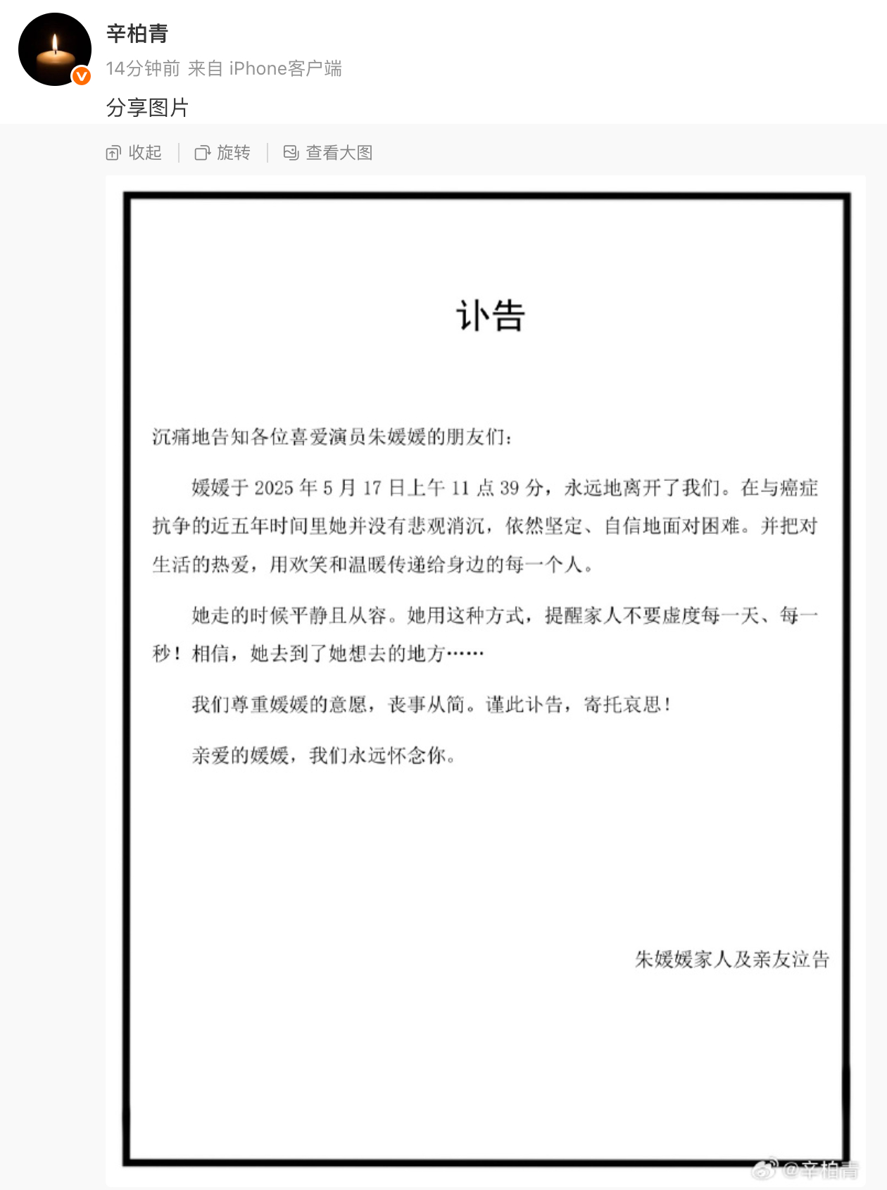 5月21日,演员辛柏青发布讣告,其妻子、演员朱媛媛于2025年5月17日上午11点39分去世。讣告中写到:“在与癌症抗争的近五年时间里她并没有悲观消沉,依然坚定、自信地面对困难。并把对生活的热爱,用欢笑和温暖传递给身边的每一个人。”