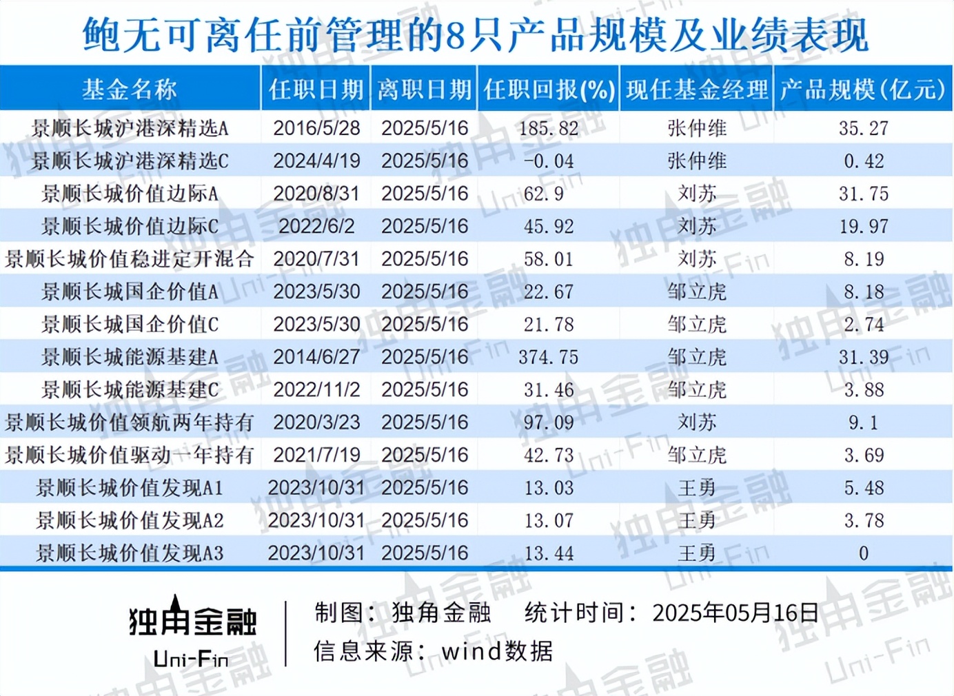 5月17日,景顺长城基金管理有限公司(下称“景顺长城”)一口气发布8只产品变更基金经理的公告,基金经理鲍无可卸任了全部产品。而在4月份,因所管的产品均增聘了基金经理,市场就传出他即将离职的猜测,如今这一猜测得以证实。