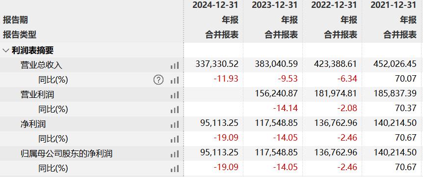梳理近四年业绩表现,公司营收和净利润在2021年分别实现45.2亿元、14亿元后,2022年-2024年连续三年业绩下滑,营收与前一年相比分别下降6.34%、9.53%、11.93%,同期净利润分别为下滑2.46%、14.05%、-19.09%。