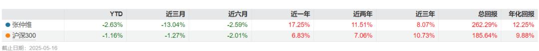 wind数据显示,张仲维在管4只产品规模80.67亿元,年化回报12.25%,高于沪深300的9.88%。