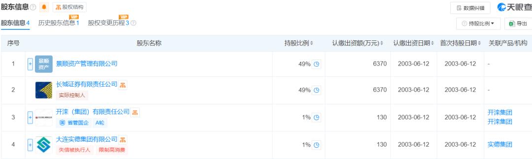 2003年成立的景顺长城是经证监会批准设立的国内首家中美合资的基金管理公司,由长城证券、景顺资产管理有限公司、开滦(集团)有限责任公司、大连实德集团有限公司共同发起设立。目前,各家持股比例分别为 49%、49%、1%、1%。