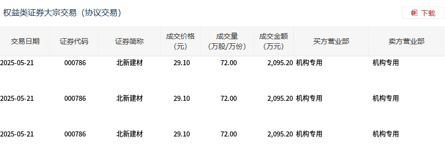 5月21日,北新建材大宗交易成交216万股,成交额6285.6万元,占当日总成交额的27.54%,成交价29.1元,较市场收盘价29.1元持平。