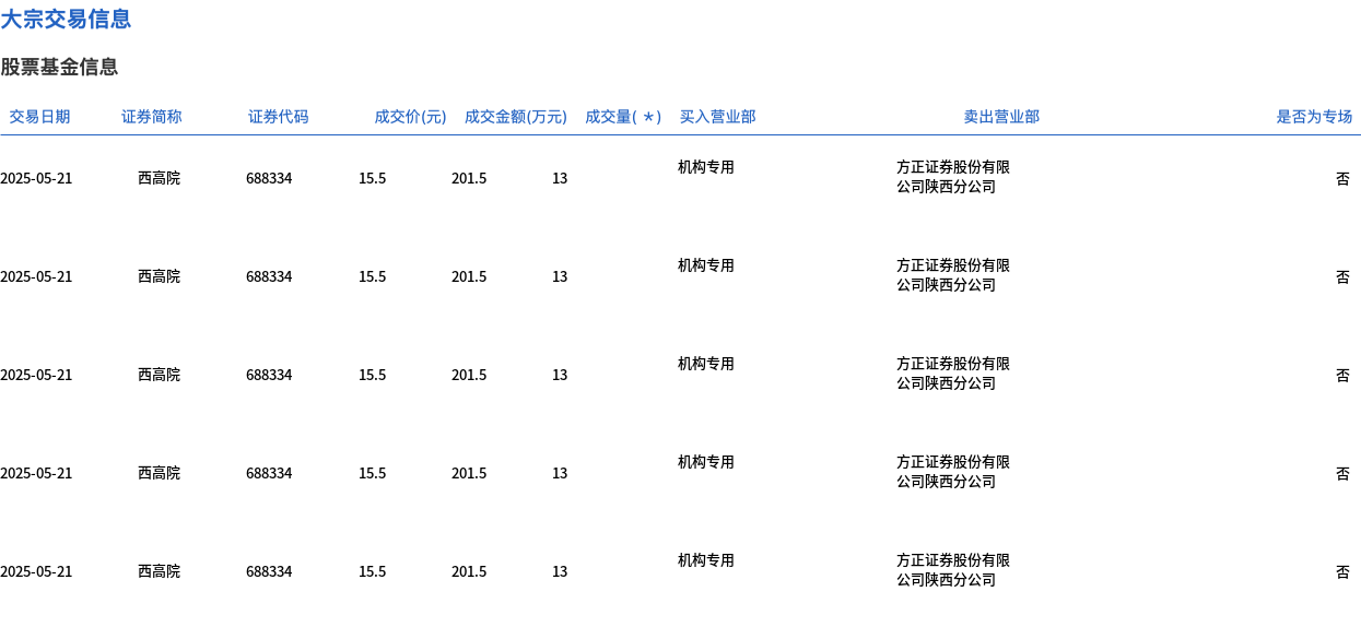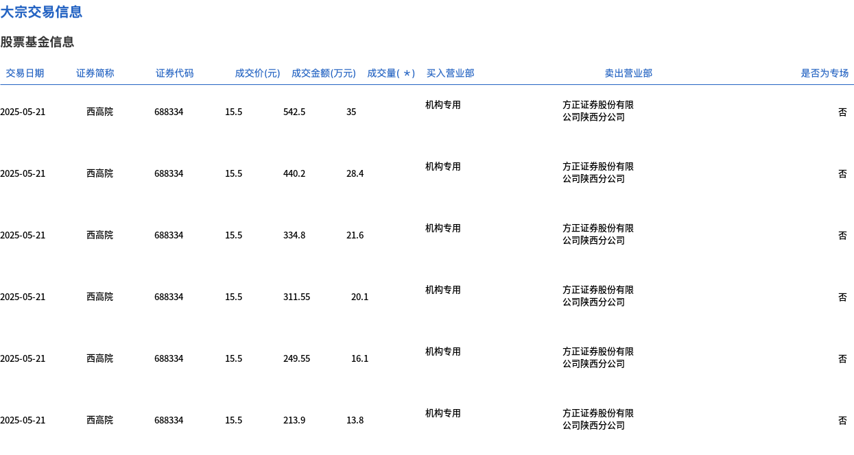 5月21日,西高院大宗交易成交200万股,成交额3100万元,占当日总成交额的35.79%,成交价15.5元,较市场收盘价17.04元折价9.04%。