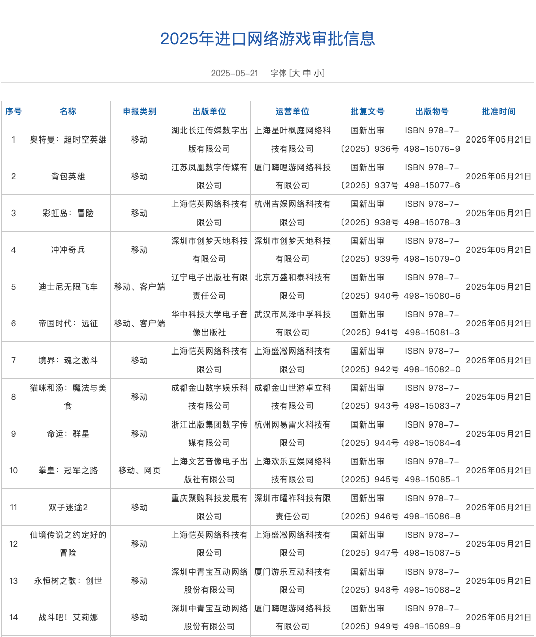 5月21日,国家新闻出版署发布2025年进口网络游戏审批信息,5月共14款进口游戏获批。