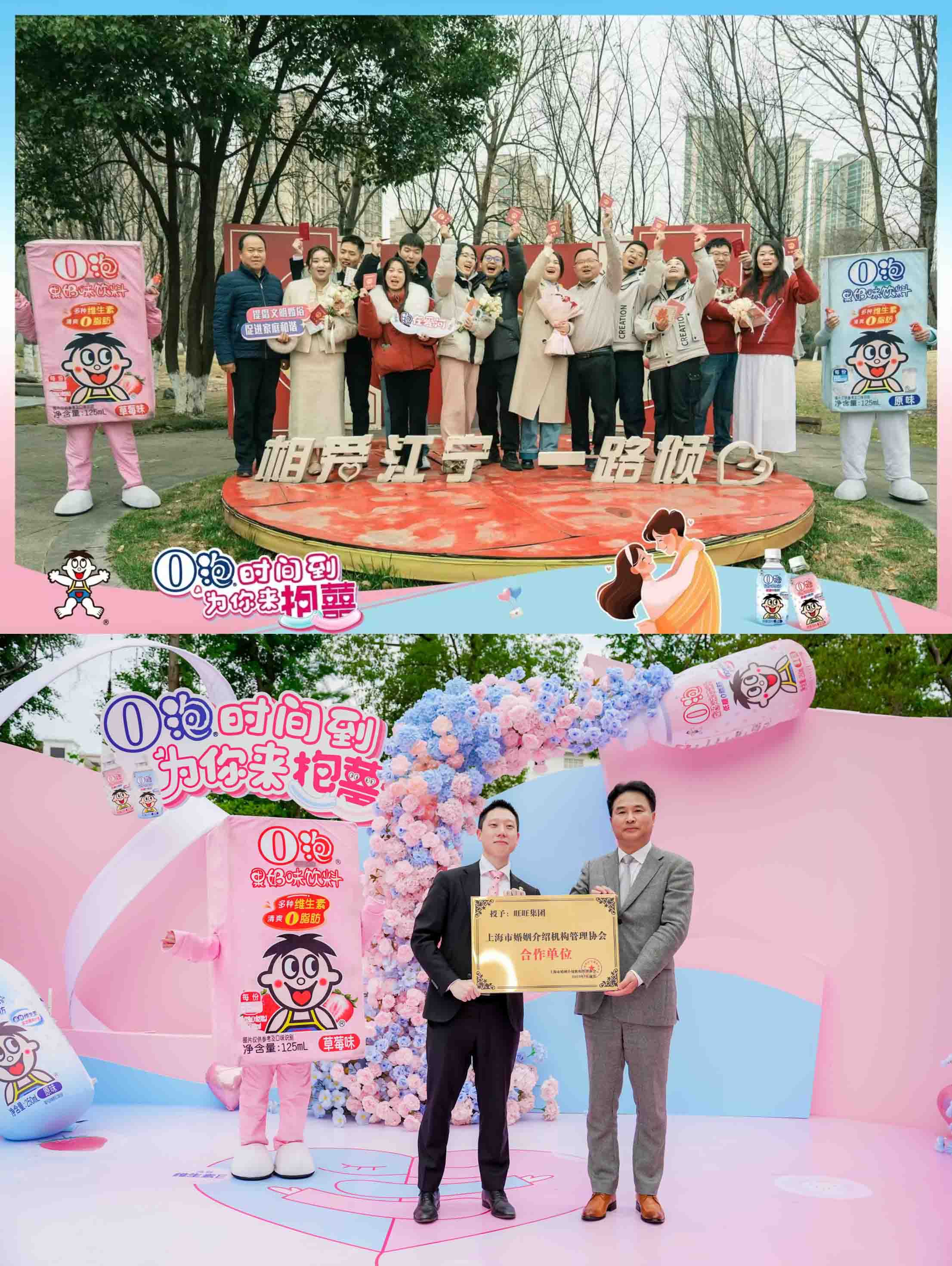 作为旺旺集团旗下国民经典饮品品牌O泡,自2024年就以“抱抱”作为核心概念,以“O泡时间到 抱抱没烦恼”为主题,深度绑定情感表达场景。2025年情人节,O泡已率先携手南京市民政局,在玄武区婚姻登记处推出“拍喜照 得喜报”、婚礼喜宴饮品赞助等互动环节,成功打造“民政局领证天花板”现象级案例,将品牌符号与婚姻仪式深度绑定。此次O泡集体婚礼则是其婚恋市场布局的升级:活动以“抱囍”为内核,将品牌行动从单一的婚姻登记场景延伸至婚宴经济、情感消费等产业链环节,形成“政府引导+品牌赋能+社会参与”的三维协同模式。