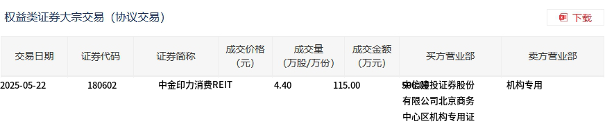 5月22日,中金印力消费REIT大宗交易成交115万股,成交额506万元,占当日总成交额的40.78%,成交价4.4元,较市场收盘价4.385元溢价0.34%。