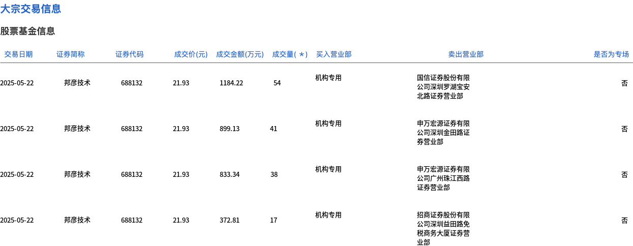 5月22日,邦彦技术大宗交易成交150万股,成交额3289.5万元,占当日总成交额的20.56%,成交价21.93元,较市场收盘价22.2元折价1.22%。