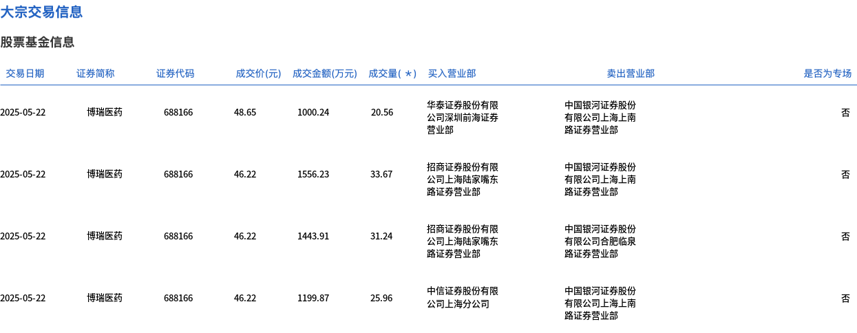 5月22日,博瑞医药大宗交易成交111.43万股,成交额5200.25万元,占当日总成交额的10.07%,成交均价46.67元,较市场收盘价48.65元折价4.07%,其中最高成交价48.65元,最低成交价46.22元。