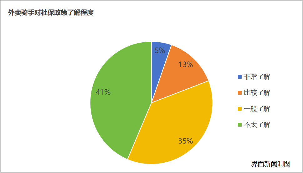 5.社保政策普及度仍不足。在本次调研中,近半数骑手呈现出对社保政策“不太了解”或“完全不了解”的状态。甚至在后续访谈中,部分在问卷调查中勾选“比较了解”的骑手,当面临界面新闻提问时,坦言对社保政策的详细内容并不清楚且觉得这些政策对自己而言意义有限。