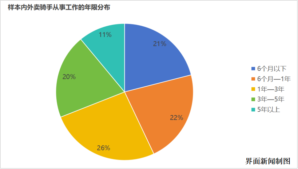 3.行业稳定性预期仍有待加强。从理论角度看,随着社保制度的逐步落地,外卖行业的稳定性会逐步增强。但此次调研仍显示,该行业因灵活性强、准入门槛低的特点,成为吸引就业者的重要因素。在本次调研中,骑手工作年限呈现两极分化态势,主要集中在1年以内和2年以上。 1年以内新手占43%,2年以上经验者占57%。 与此同时,参与此次问卷调查的2/3的骑手向界面新闻透露,他们选择这份工作,仍看中其灵活性高、相对自由的特点。不少骑手还透露,打算先干几年攒些钱,之后就会考虑转行,并不打算长期从事外卖行业。