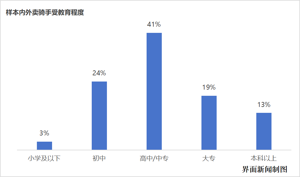 调研对象的基本画像可在问卷数据中窥见一斑:随机调查样本范围内,从业者以男性居多,年龄层面主要集中在26至35岁的中青年群体。外卖骑手的受教育程度整体偏低。