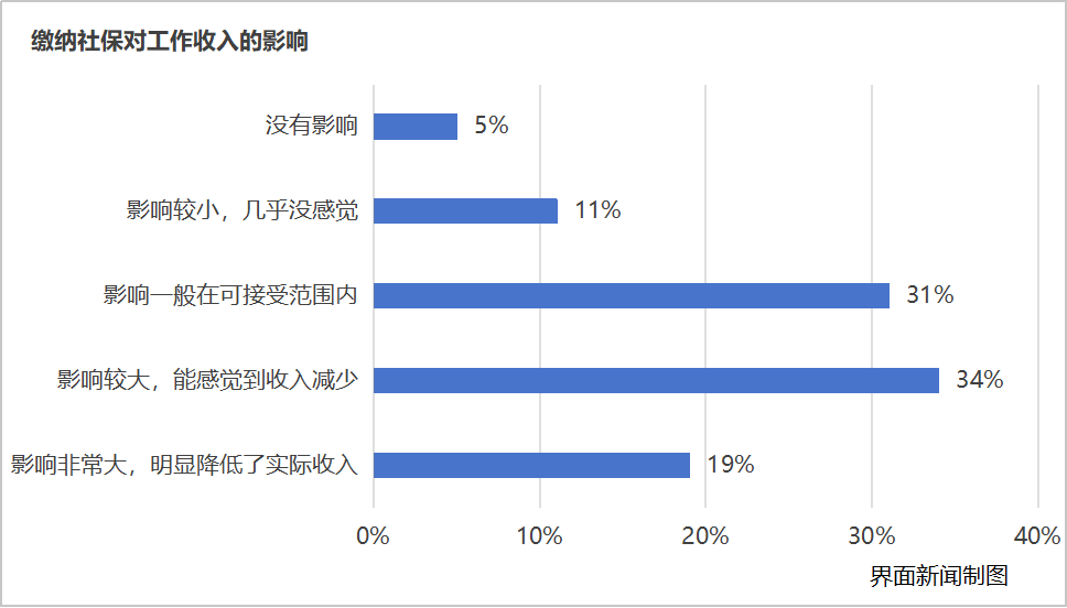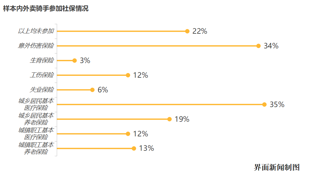 6.在骑手目前参与的保险类型里,意外伤害险和城乡居民基本医疗保险是主要险种。在多选题“您目前参加了哪些社会保险”中,意外伤害险与城乡居民基本医疗保险的占比比例最高,分别占比为34%、35%。同时,界面新闻通过后续访谈了解到,多数骑手认为,意外险和城乡居民基本医疗保险已能够满足他们的基本生活保障需求,而其他险种对他们而言只会增加缴纳负担。尤其是一些刚入行不久的年轻骑手,他们更直言不讳地表示,养老保险目前并不在自己的考虑范围内,因为平台已经为他们缴纳了意外伤害险,这在他们看来已经足够。
