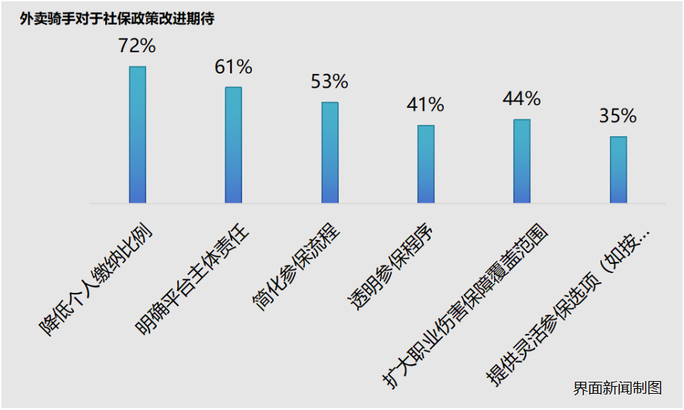 11. 降低个人社保缴费比例,明确平台主体责任道出了骑手心声。在外卖骑手对于社保政策改进方面,“降低个人缴费比例”“明确平台责任”以及“简化参保流程”这三个选项的占比位居前列。