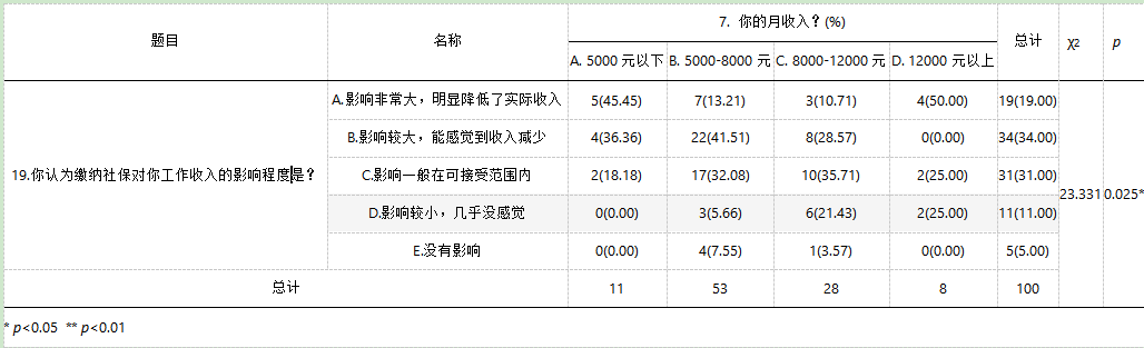 2. 工作收入会对骑手缴纳社保的意愿产生显著正相关影响。界面新闻借助卡方检验(交叉分析)方法,深入探究了问题 7“你的月收入?”与“你认为缴纳社保对你工作收入的影响程度是?”这两项数据之间的关联性差异。分析结果表明,不同月收入水平的样本群体,在“你认为缴纳社保对你工作收入的影响程度是?”这一问题上的回答存在显著差异(p < 0.05)。这意味着,不同月收入的骑手样本对于缴纳社保对自身工作收入影响程度的认知并不一致。具体而言,月收入处于 5000 元以下以及 5000 元至 8000 元这两个区间的骑手,认为缴纳社保对自己收入影响非常大的比例较高;月收入处于8000至12000元之间的骑手认为缴纳社保对于工作收入的影响程度较小,几乎没感觉。值得注意的是,不存在认为完全没有影响收入的骑手。