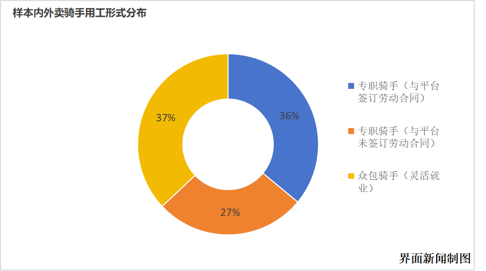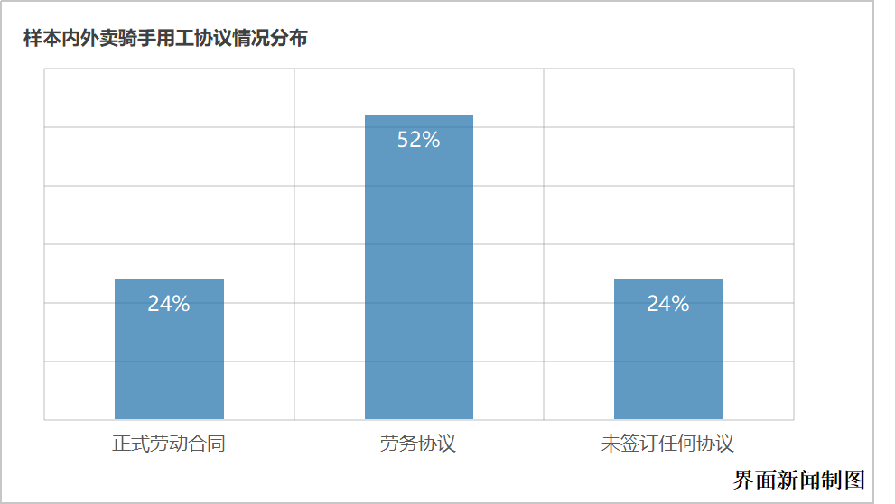 4.劳动权益保障存在隐性风险。在本次调研中,仅有 36%的专职骑手与平台签订了劳动合同。此外,从用工协议类型来看,未能建立起长期稳定劳动关系的骑手总计占比高达 76%。在后续的访谈当中,我们发现大部分骑手多为众包类,平台通常只为他们购买意外险。不过,在新职伤试点范围内工作的骑手,平台给个人购买了新职业伤害险。