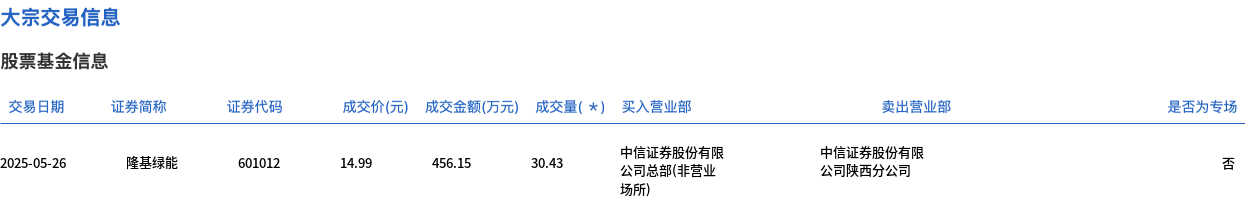 5月26日,隆基绿能大宗交易成交30.43万股,成交额456.15万元,占当日总成交额的0.82%,成交价14.99元,较市场收盘价14.99元持平。