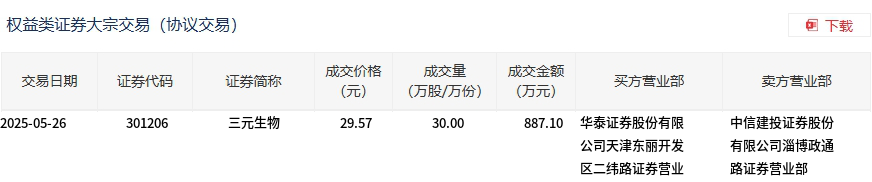 5月26日,三元生物大宗交易成交30万股,成交额887.1万元,占当日总成交额的4.95%,成交价29.57元,较市场收盘价29.87元折价1%。