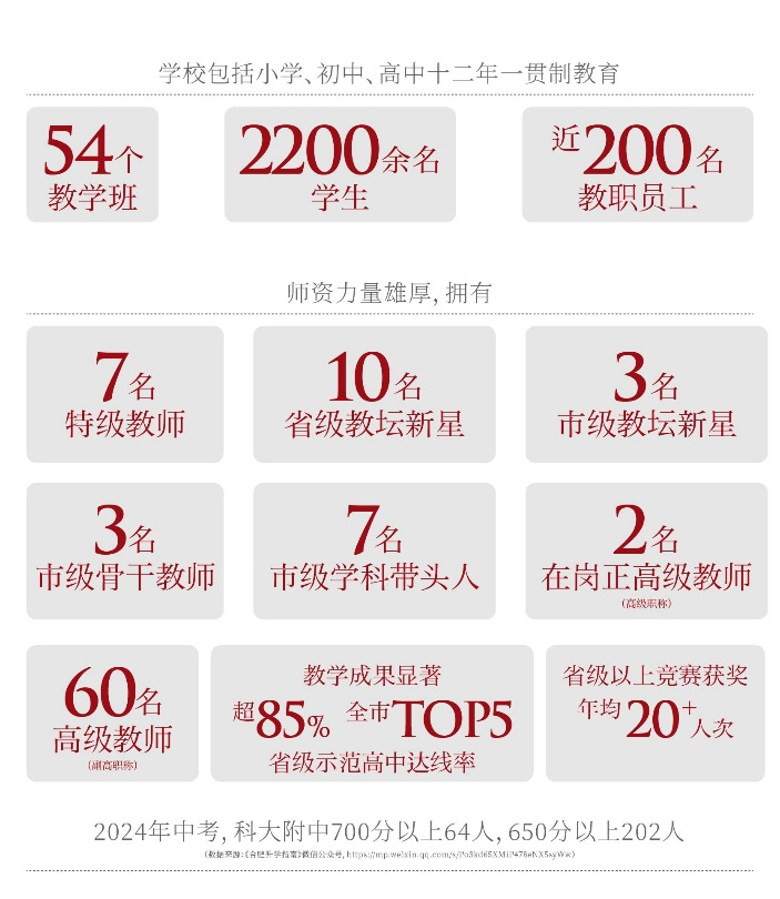 科大附中(本部):一流高中升学保障依托中国科学技术大学的教育资源,推进“创特色、上层次、争一流”的办学目标。学校包括小学、初中、高中十二年一贯制教育:54个教学班、2200余名学生、近200名教职员工;师资力量雄厚,拥有“特级教师7名、省级教坛新星10名、市级教坛新星3名、市级学科带头人7名、市级骨干教师3名、在岗正高级教师(高级职称)2名、高级教师(副高职称)60人;教学成果显著,省级示范高中达线率超85%全市TOP5,省级以上竞赛获奖年均20+人次。2024年中考,科大附中700分以上64人,650分以上202人。(数据来源:《合肥升学指南》微信公众号,https://mp.weixin.qq.com/s/Po3kd65XMiP478eNX5syWw)