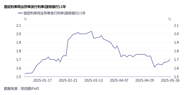 不过,期间同业存单利率却并未出现下行。同花顺ifnd数据显示,在存款利率和贷款利率下调之前国有大行一年期同业存单发行利率为1.64%,“双降”后同业存单利率不降反升,5月26日升至1.7%,其他类型银行存单发行利率也呈现类似走势。