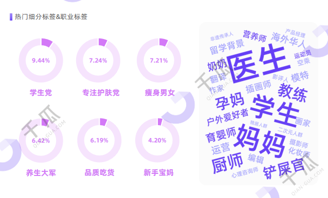 在美妆个护行业中,医护人员与二次元群体同列TOP30职业标签;母婴行业里,汉服爱好者与育婴师的身份重叠;全民健康时代,学生、孕妈、厨师、医生、育婴师、铲屎官、户外爱好者等都是大健康行业热门达人标签,折射出消费人群的多元融合。