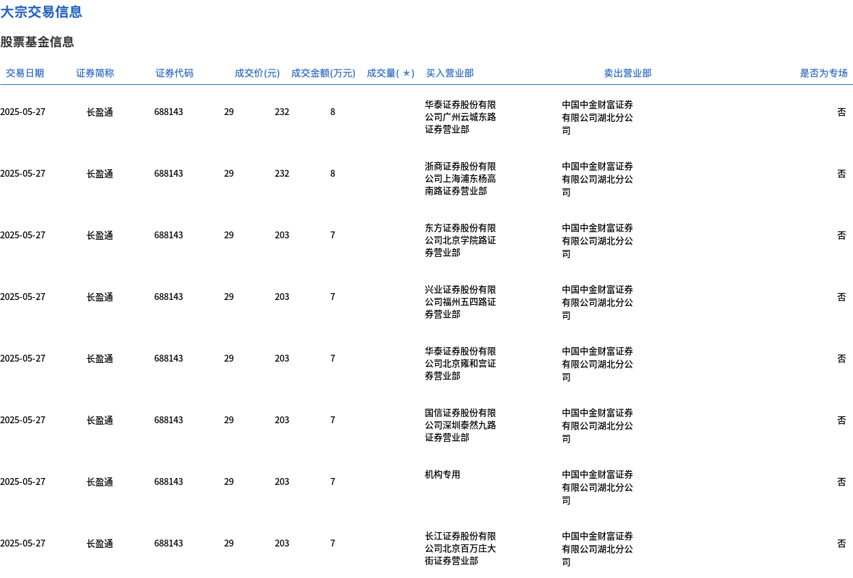 5月27日,长盈通大宗交易成交58万股,成交额1682万元,占当日总成交额的34.85%,成交价29元,较市场收盘价31.32元折价7.41%。