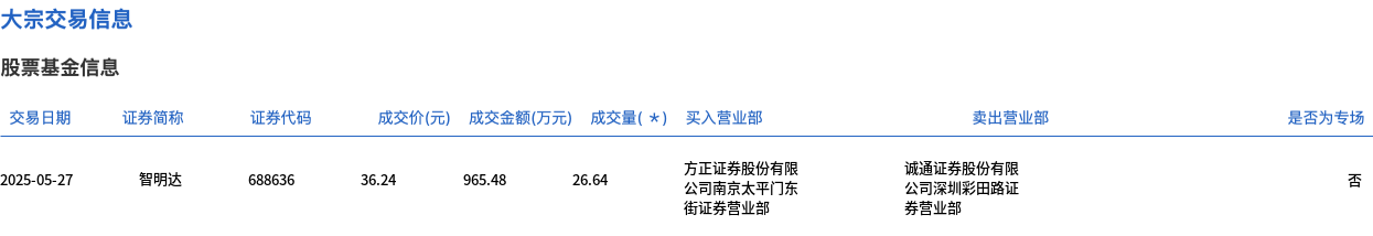 5月27日,智明达大宗交易成交26.64万股,成交额965.48万元,占当日总成交额的17.66%,成交价36.24元,较市场收盘价39.8元折价8.94%。