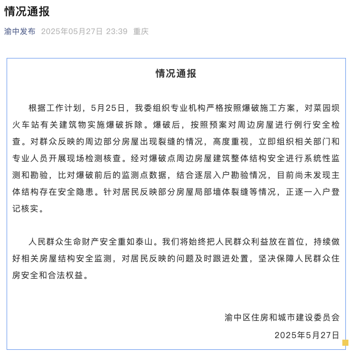 5月27日晚,重庆市渝中区住房和城市建设委员会发布情况通报:根据工作计划,5月25日,我委组织专业机构严格按照爆破施工方案,对菜园坝火车站有关建筑物实施爆破拆除。爆破后,按照预案对周边房屋进行例行安全检查。对群众反映的周边部分房屋出现裂缝的情况,高度重视,立即组织相关部门和专业人员开展现场检测核查。经对爆破点周边房屋建筑整体结构安全进行系统性监测和勘验,比对爆破前后的监测点数据,结合逐层入户勘验情况,目前尚未发现主体结构存在安全隐患。针对居民反映部分房屋局部墙体裂缝等情况,正逐一入户登记核实。