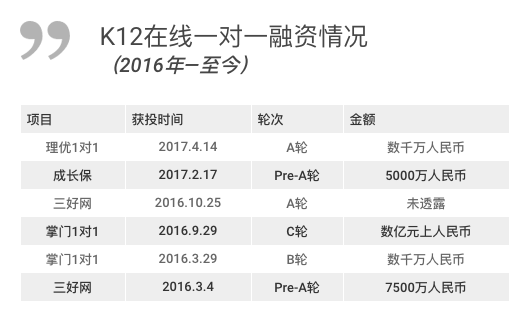 根据公开资料,外教在线一对一在2016年有7起大额融资,K12在线一对一从去年截止到目前也有6起大额融资。