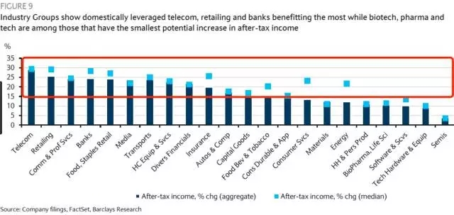 企业税率降低后,曾经缴税越高的企业将获益最大。据Barclays研究统计,消费零售企业、通信、银行、媒体、交通等可能最大幅度受益于减税,减税能直接降低了企业费用,提高了利润。而原本企业税就低于15%的企业,在这次税改后倒也捡不到什么便宜.