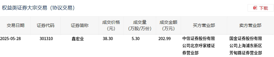 5月28日,鑫宏业大宗交易成交5.3万股,成交额202.99万元,占当日总成交额的0.62%,成交价38.3元,较市场收盘价39.48元折价2.99%。
