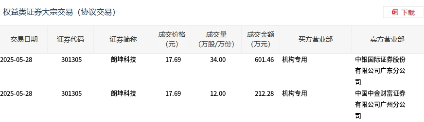 5月28日,朗坤科技大宗交易成交46万股,成交额813.74万元,占当日总成交额的11.76%,成交价17.69元,较市场收盘价17.87元折价1.01%。