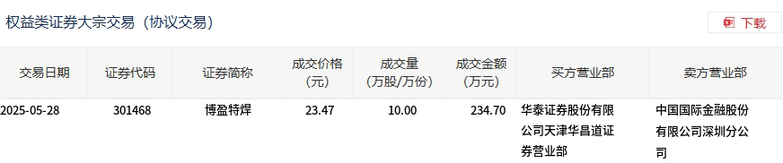 5月28日,博盈特焊大宗交易成交10万股,成交额234.7万元,占当日总成交额的1.67%,成交价23.47元,较市场收盘价23.71元折价1.01%。