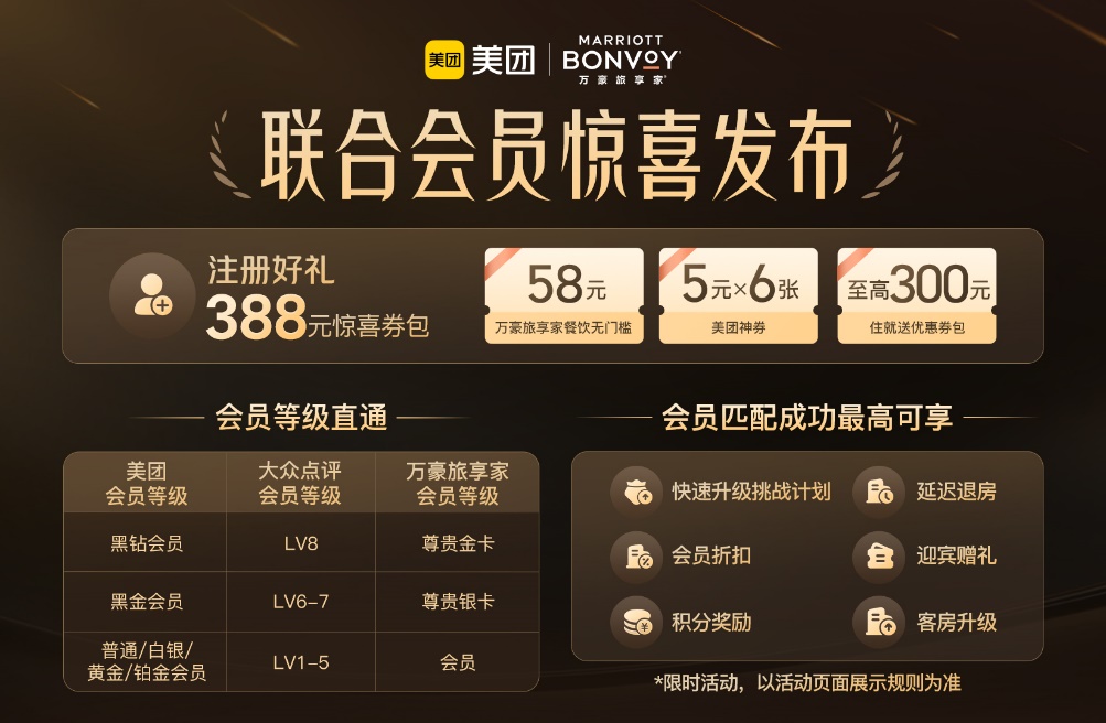 即日起至2026年5月27日,美团、大众点评会员可根据自身等级匹配成为相应等级的万豪旅享家会员,并有机会参与会籍挑战,限时获享万豪旅享家尊贵会籍专属权益,同时还有机会获得价值高达388元的“吃喝玩乐住”一站式款待券包。