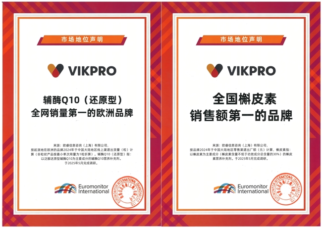 立足“德国科技,细胞营养”的品牌理念,VIKPRO不断推陈出新,致力于为全球消费者提供科学、专业、精准的健康解决方案。凭借在细胞营养领域的领先地位,VIKPRO一举斩获全球权威市场调研机构欧睿国际颁发的“辅酶Q10(还原型)全网销量第一的欧洲品牌”和“全国槲皮素销售额第一的品牌”双冠王认证,充分彰显了VIKPRO卓越的产品品质、强大的品牌影响力与出色的市场表现,进一步提升了VIKPRO在营养膳食领域的市场地位。