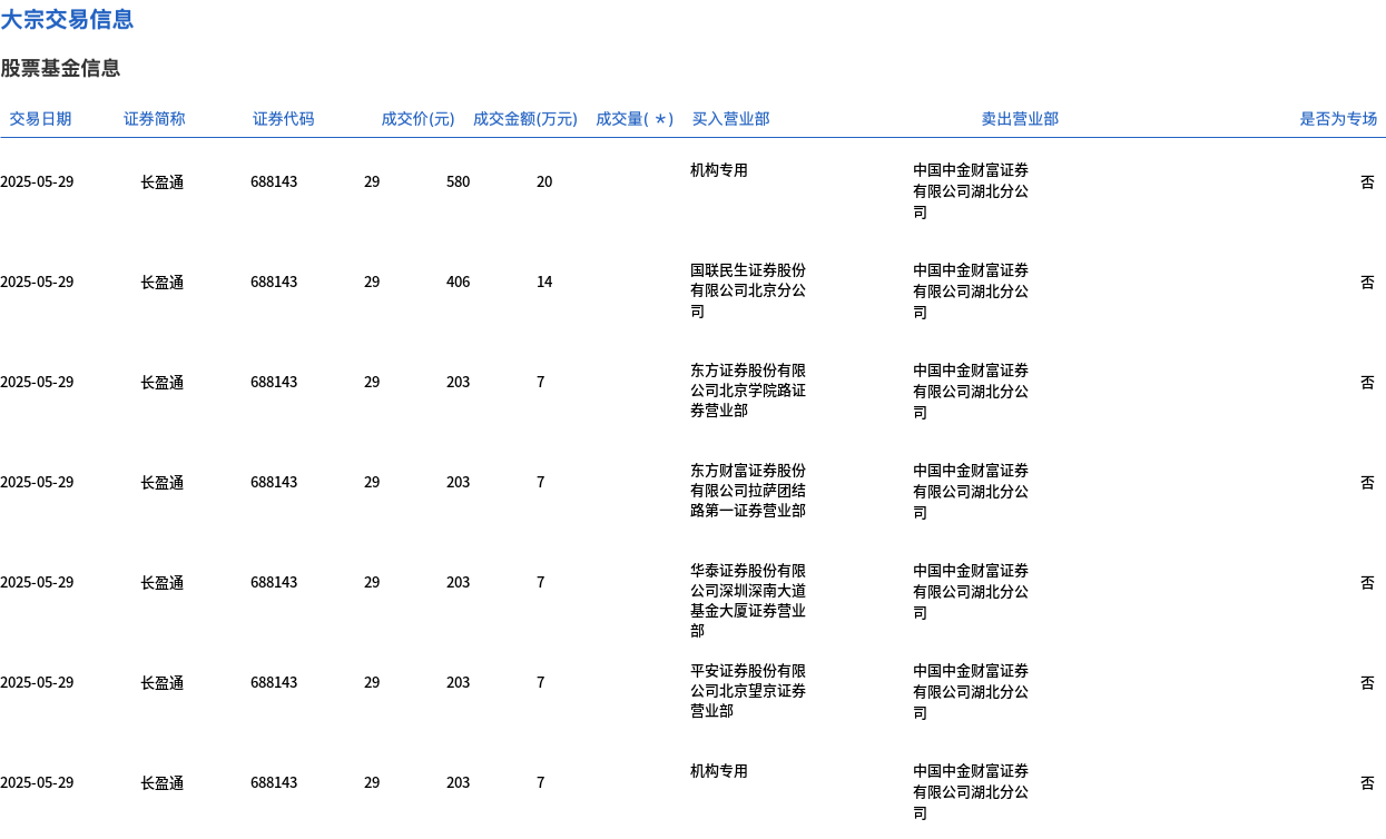 5月29日,长盈通大宗交易成交69万股,成交额2001万元,占当日总成交额的26.99%,成交价29元,较市场收盘价31.7元折价8.52%。