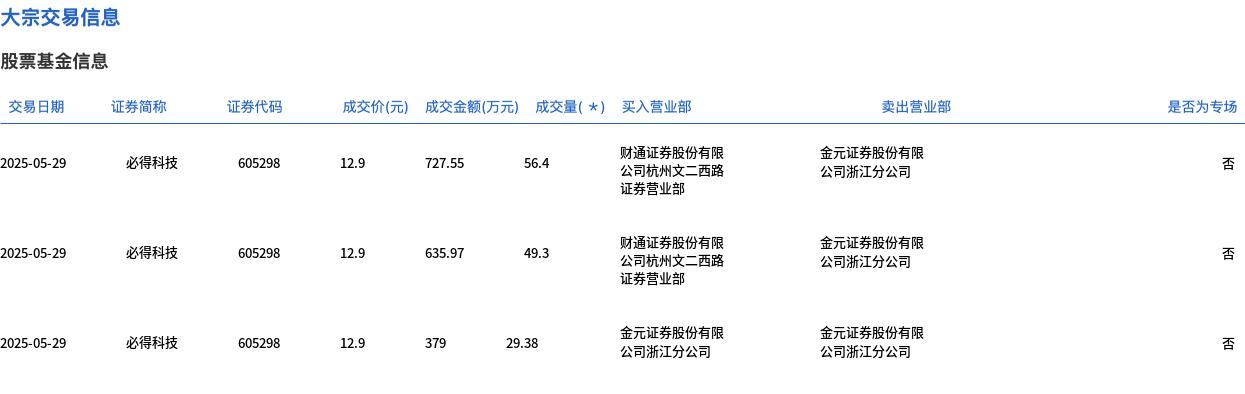 5月29日,必得科技大宗交易成交135.08万股,成交额1742.52万元,占当日总成交额的39.39%,成交价12.9元,较市场收盘价12.9元持平。